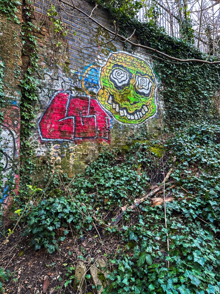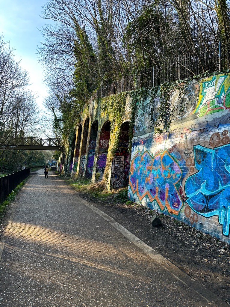 From here, the vibe shifts. You step off the pavements and into another world — a winding path lined with overgrown trees, ivy-covered walls, and layers of graffiti that pop out from the old brick arches. It’s like walking through an open-air art gallery that’s been slowly swallowed by a forest.